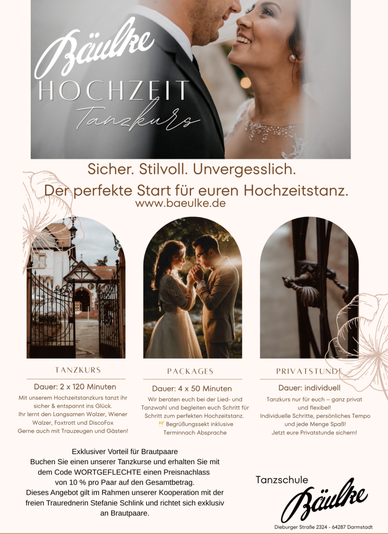 Bucht ihr mit meiner Empfehlung, erhaltet ihr 10% Rabatt auf euren Hochzeits-Tanzkurs.